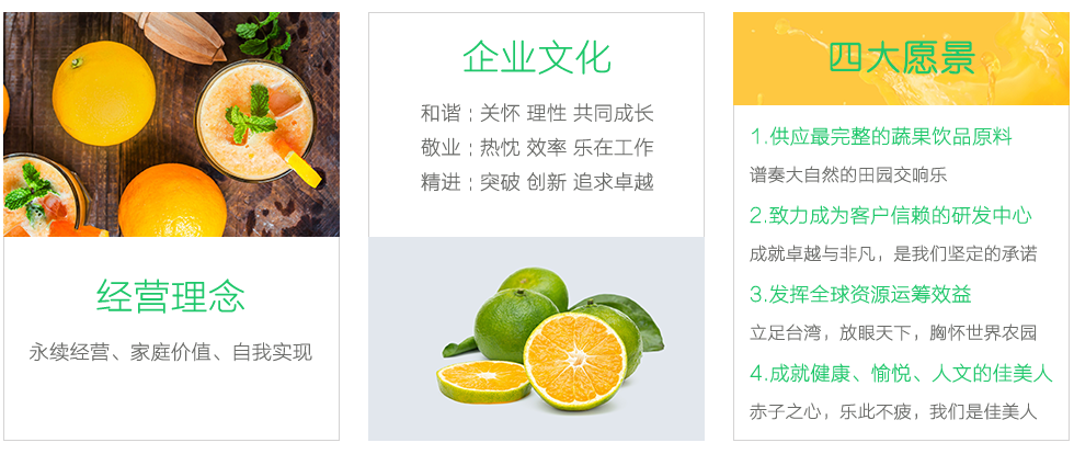 在公司發(fā)展壯大的13年里,我們始終為客戶提供好的產(chǎn)品和技術(shù)支持、健全的售后服務(wù),不斷引進(jìn)國外的先進(jìn)技術(shù)和科學(xué)管理模式,逐步健全了與產(chǎn)品發(fā)展相適應(yīng)的具有農(nóng)產(chǎn)品加工特點(diǎn)的質(zhì)量管理體系,全體職員本著“和諧、敬業(yè)、精進(jìn)”的理念,竭誠為國內(nèi)外的顧客提供最優(yōu)質(zhì)的服務(wù)。我公司采用國內(nèi)、外先進(jìn)生產(chǎn)設(shè)備,年生產(chǎn)能力20000噸以上,主要產(chǎn)品包括:橙濃縮汁、蜜橘濃縮汁、柑橘原汁、檸檬原汁、血橙濃縮汁、芒果漿、橙果粒罐頭、橙瓣罐頭、白柚果粒罐頭、仙草凍罐頭、檸檬切片罐頭、速凍橙蓉、速凍檸檬蓉、速凍橙皮(丁、絲)、速凍檸檬皮(丁、絲)、蜜漬橙皮檸檬片、柚子等。南充佳美產(chǎn)品行銷覆蓋全國及遠(yuǎn)銷海內(nèi)外,是國內(nèi)濃縮汁、原汁、及速凍產(chǎn)品行業(yè)規(guī)格最大、最具競爭力的企業(yè)之一,期待與您的合作。